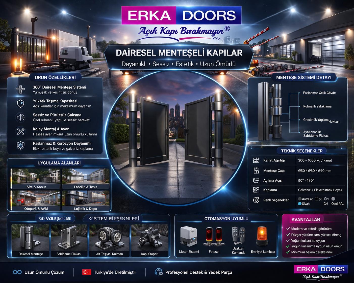 Estetik tasarımı, sessiz çalışma mekanizması ve dengeli dönüş hareketi sayesinde kullanıcı deneyimini üst seviyeye çıkaran Erka Doors çözümleri, aynı zamanda enerji verimliliğine de katkı sağlar. Farklı kaplama ve ölçü seçenekleri ile her projeye özel olarak uyarlanabilen dairesel menteşeli kapılar, mimarların ve tasarımcıların ilk tercihleri arasında yer almaktadır.